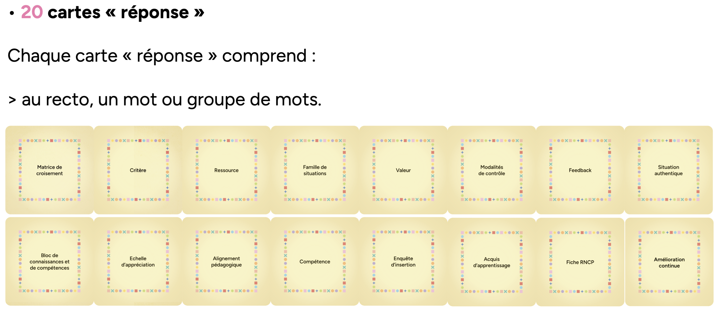 La DACIP (Univ. Lorraine) a créé un jeu sur l’APC (en fait une déclinaison "Compétence" de leur dispositif Pêle-Mêle) pour sensibiliser aux terminologies et identifier les étapes clés de l’APC. Il est personnalisable et adaptable. La règle du jeu est ici et on peut demander les sources pour imprimer. C’est en licence CC. A éventuellement tester ?